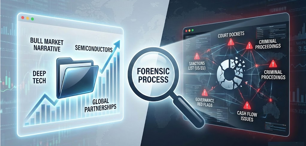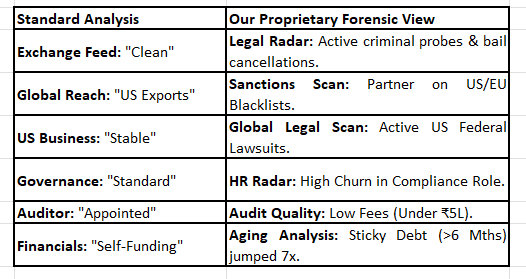 As our readers/ clients would know, at our firm, we do not invest in narratives. We invest only after they have survived our process oriented research and forensics framework. While the “Street” was reading the company’s press releases, our proprietary Forensic Engine was scouring global sanctions lists, US federal court dockets, and obscure balance sheet footnotes. Here is how our unique process uncovered a minefield that standard analysis completely missed.