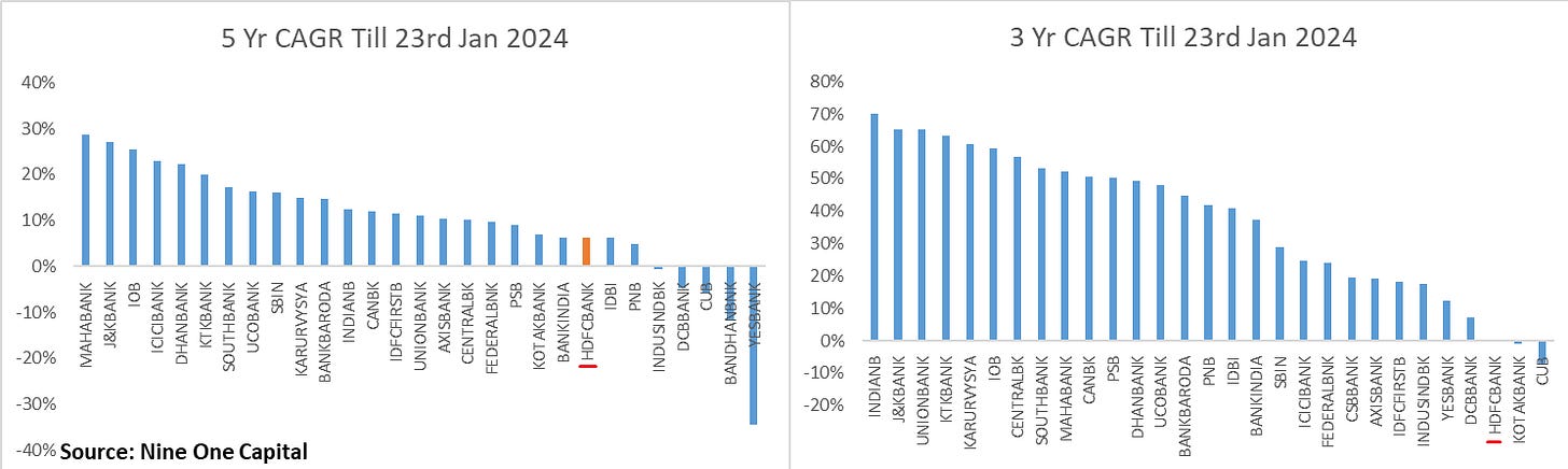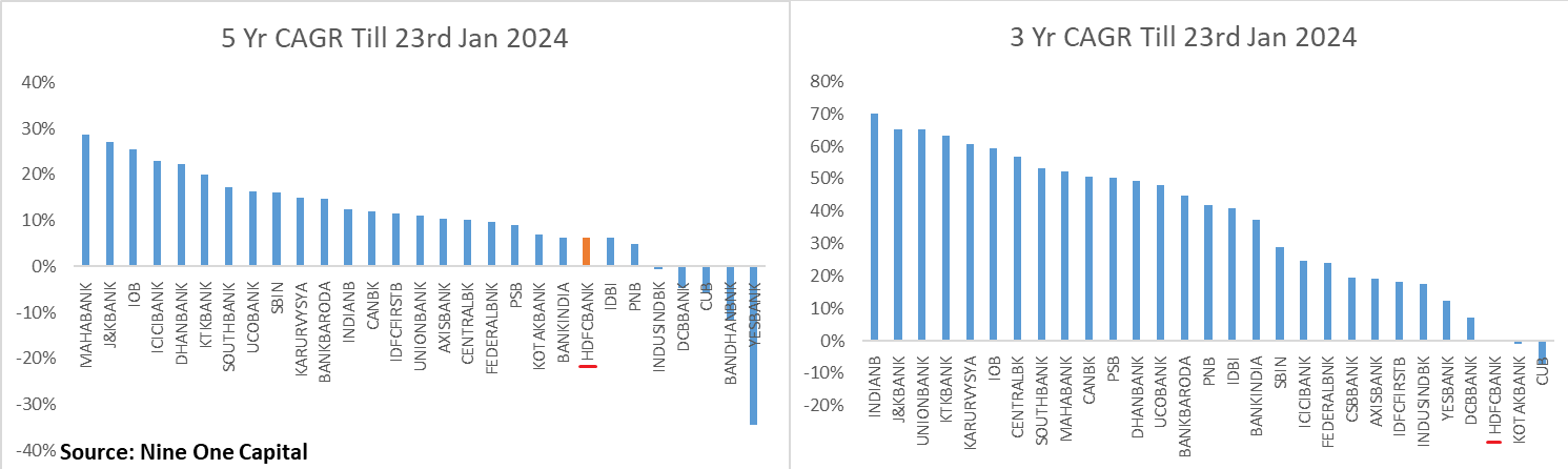 The bank has been underperforming the other banks (in terms of stock price performance) for quite a while – over a 5-year and 3-year basis, HDFCB’s stock price performance is in the bottom quartile as shown below. However, the latest blow to the stock price was triggered by the bank’s Q3 results which the bank disclosed last week on 16 Jan 2024. Let’s try to understand what happened in the Q3 FY24 results which is spooking its investors.