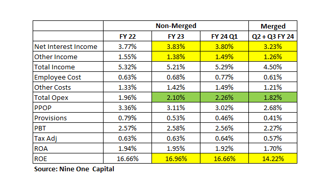 Access to lower cost of funds was the most important synergy benefit mentioned as the rationale for this merger. However, with an overall liquidity shortage in the system, virtually all banks have been showing lower deposit growth Vs the advances growth. CASA growth is even lower than deposit growth. This makes it tough for HDFCB to replace this higher-cost borrowings with lower-cost deposits as anticipated at the time of the merger. Let’s see its impact on the bank’s ROE tree: