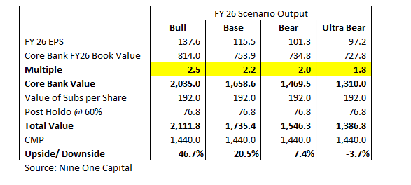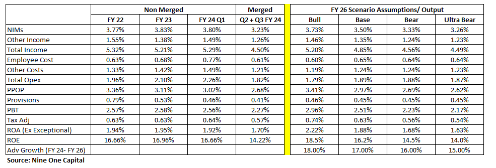 Let’s try to visualize the scenario for FY 26 under different assumptions as shown below. In the bull case, we assume that the NIMs go back to where they were before the merger with merger benefits at the Opex level while in the bearmost case, we assume NIMs to remain structurally low but Opex related benefits to be there. We assume different growth rates under these scenarios to account for various unknowns.