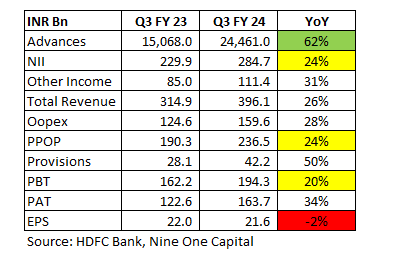 There must be something terrible that must have happened in its Q3 results that has unnerved the institutional investors. Q3 FY24 was the second such quarter where the bank reported the merged entity numbers. Here is the quick YoY snapshot for the same with relevant metrics: